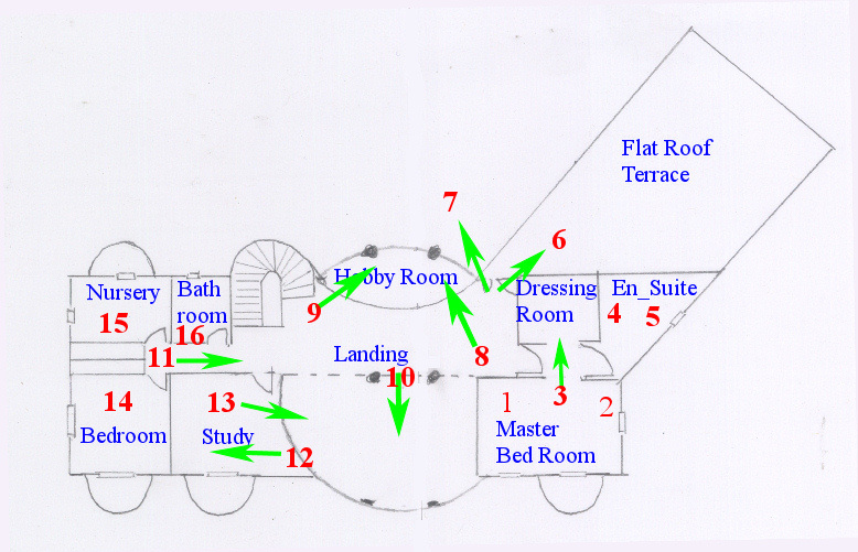 The numbers in RED on the plan indicate photographs. The direction of the photo shoot is shown by a GREEN arrow.